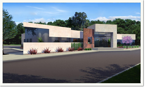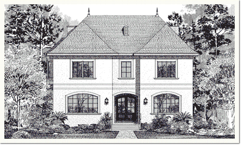 Two point perspective views are the most common as they best depict the massing of a building. They are best suited for stand alone buildings, corner lot residences, or any building having more than a single adjacent side of interest. One point perspectives are usually used when the primary facade has relief elements of interest that would not be well represented with a rendered elevation.